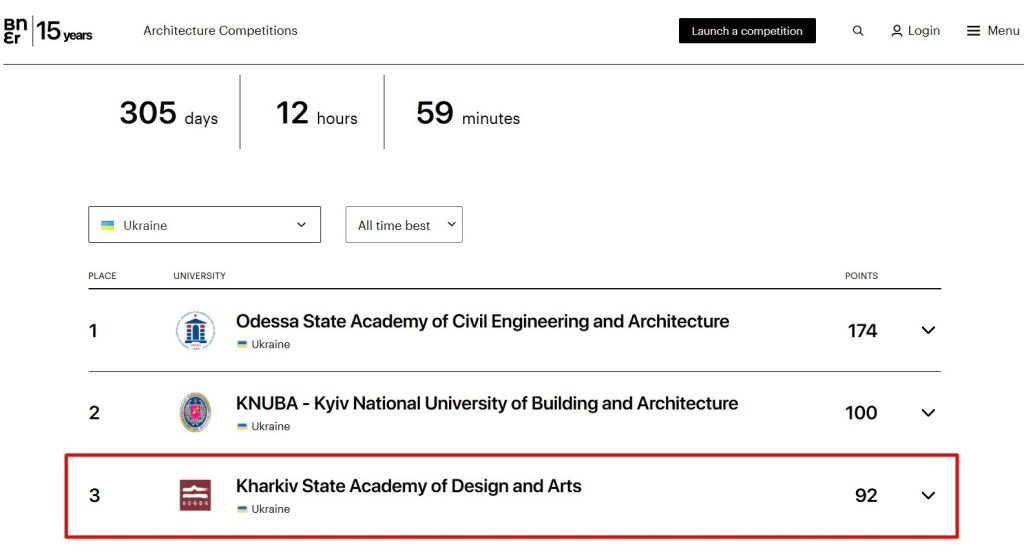 Посилання на рейтинг: https://architecturecompetitions.com/architecture-university-rankings/kharkiv-national-university-of-civil-engineering-and-architecture-knucea?y=all&country=242