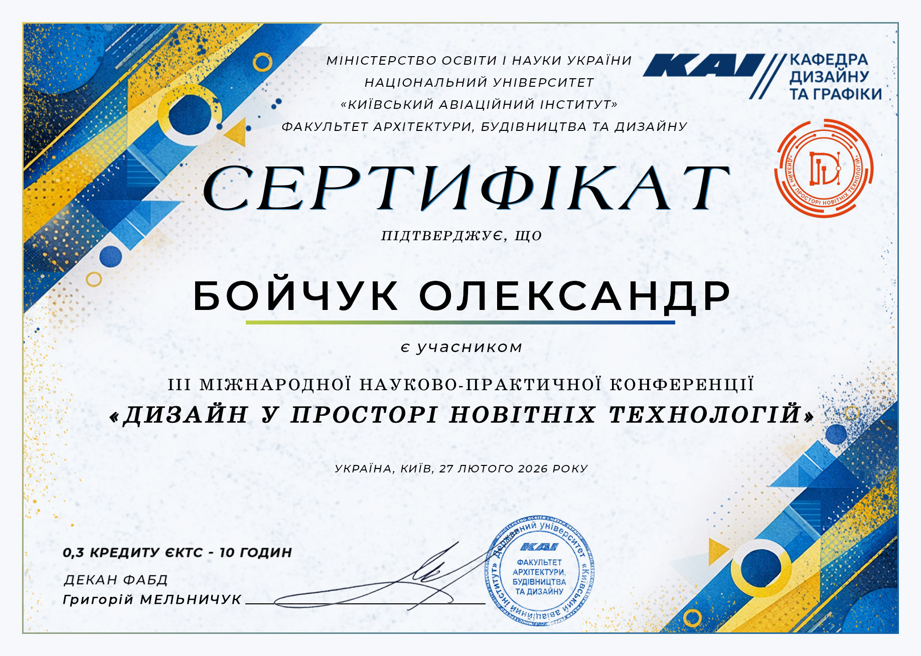 • Щиро вітаємо проф. Бойчука Олександра з отриманням СЕРТИФІКАТУ УЧАСНИКА ІІІ МІЖНАРОДНОЇ НАУКОВО-ПРАКТИЧНОЇ КОНФЕРЕНЦІЇ «ДИЗАЙН У ПРОСТОРІ НОВІТНІХ ТЕХНОЛОГІЙ». Ваша активна участь у подібних науково-практичних заходах чудово доповнює вашу багаторічну експертизу в дизайні та викладацьку діяльність. Бажаємо невичерпного натхнення, нових цікавих досліджень та успішної реалізації всіх творчих задумів!