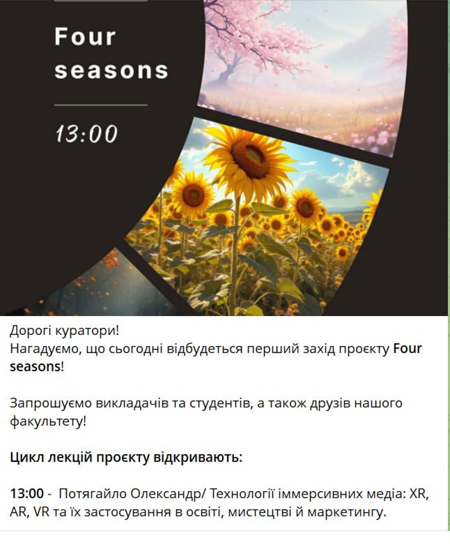 15-24 квітня 2025 р. Цикл лекцій «Fout Seasons» (захист педагогічної практики студентів-магістрів ОНП «Аудіовізуальне мистецтво та виробництво» та «Ааудіовізуальне мистецтво та медіатехнології»)