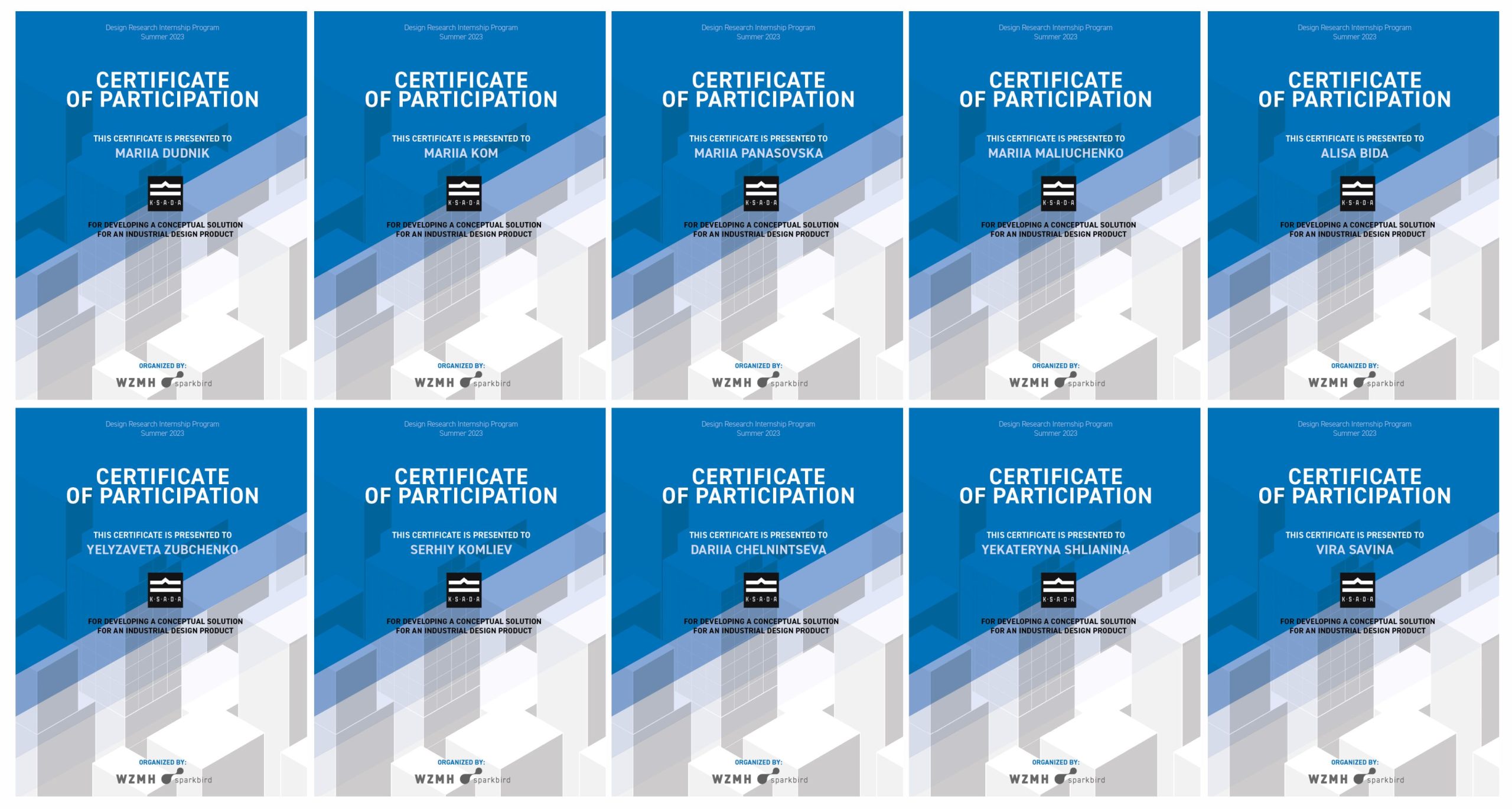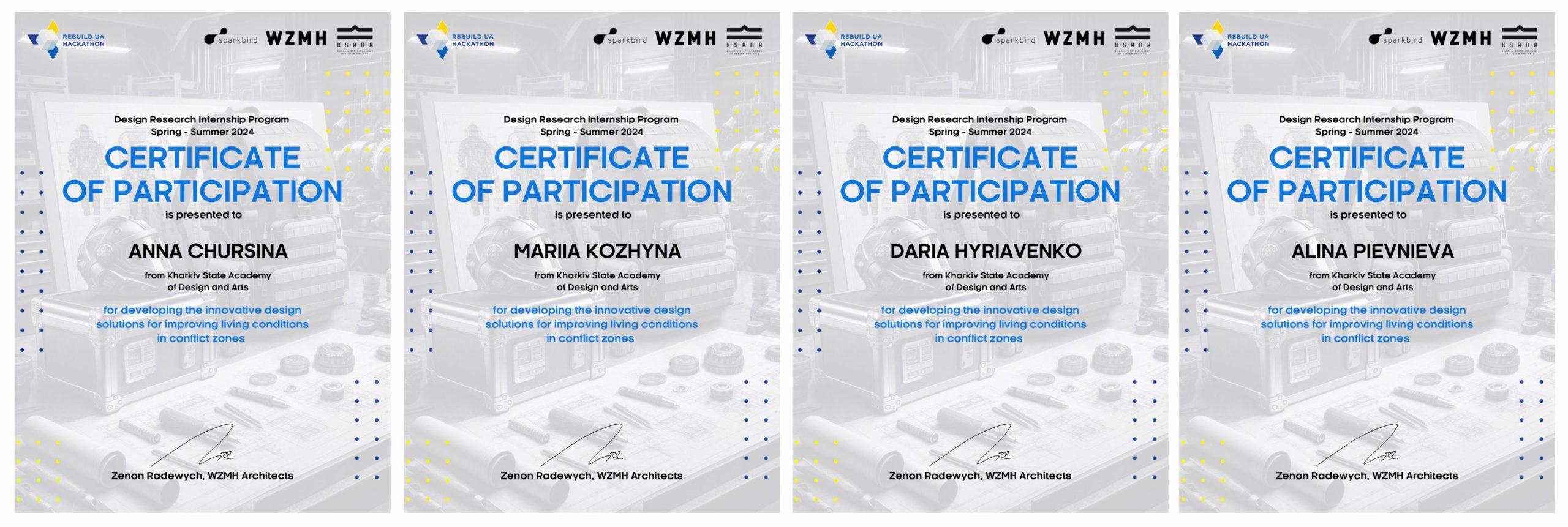 Архітектурна фірма WZMH (Канада, м.Торонто) за результатами літньої програми дизайн-стажування зі студентами 3 курсу привітала з успішним проходженням практики-конкурсу та нагородила учасників і переможців сертифікатами та цінними призами.