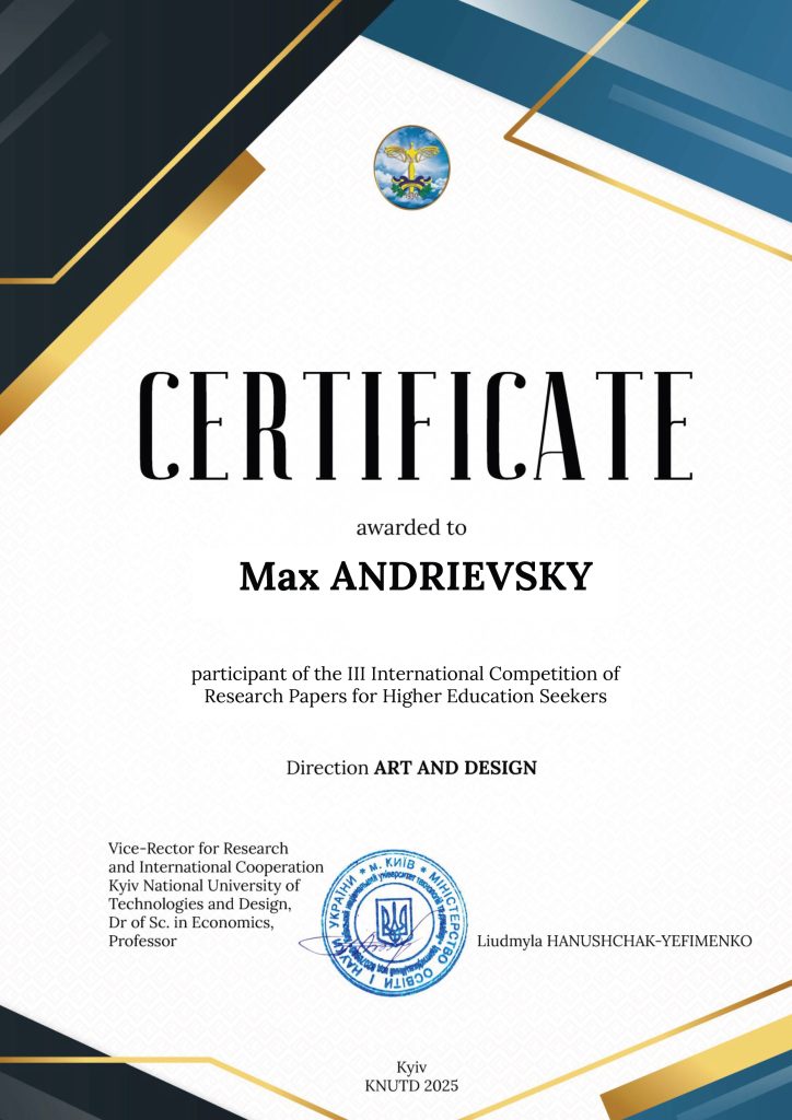 Вітаємо студента та його керівника з участю та отриманням сертифіката ІІІ Міжнародного конкурсу наукових робіт здобувачів вищої освіти за напрямом «Art and Design».