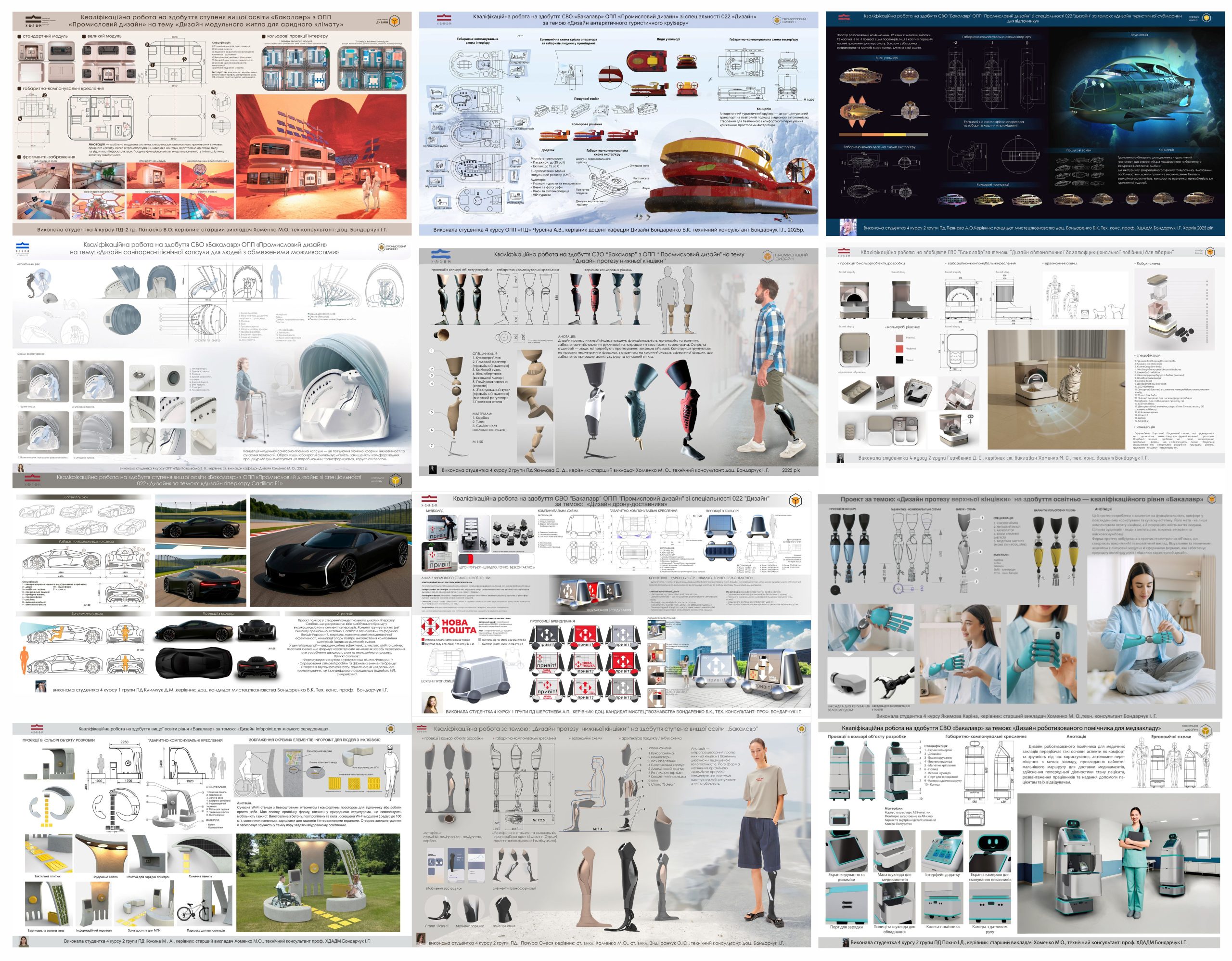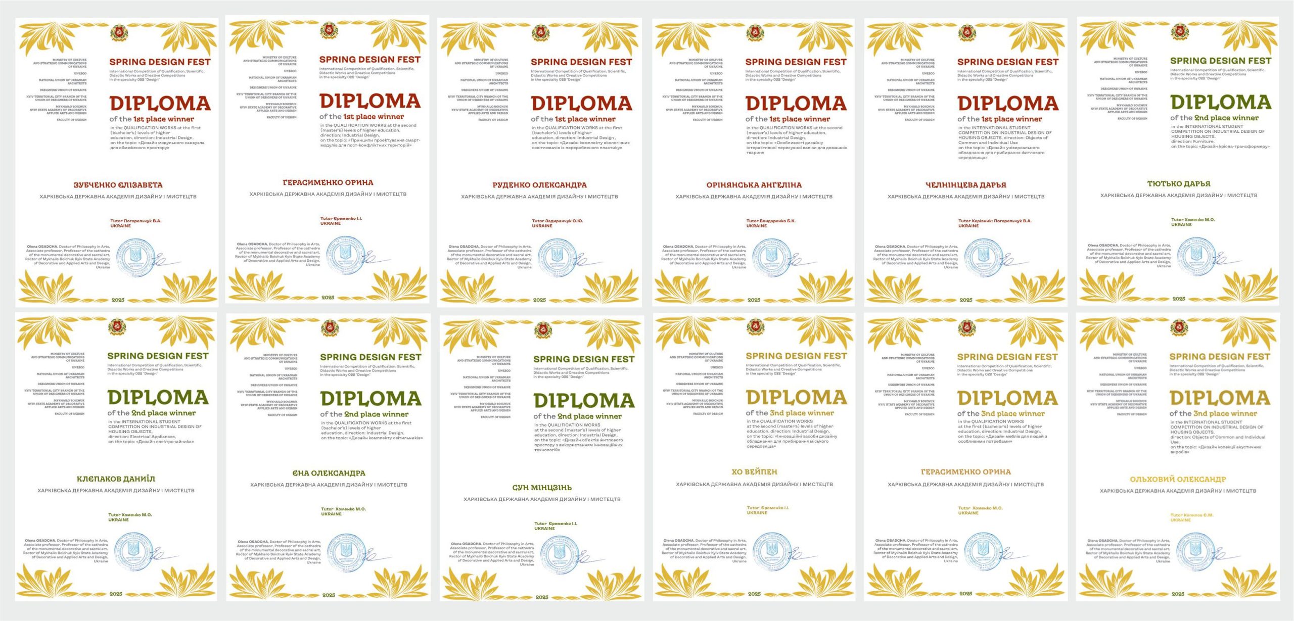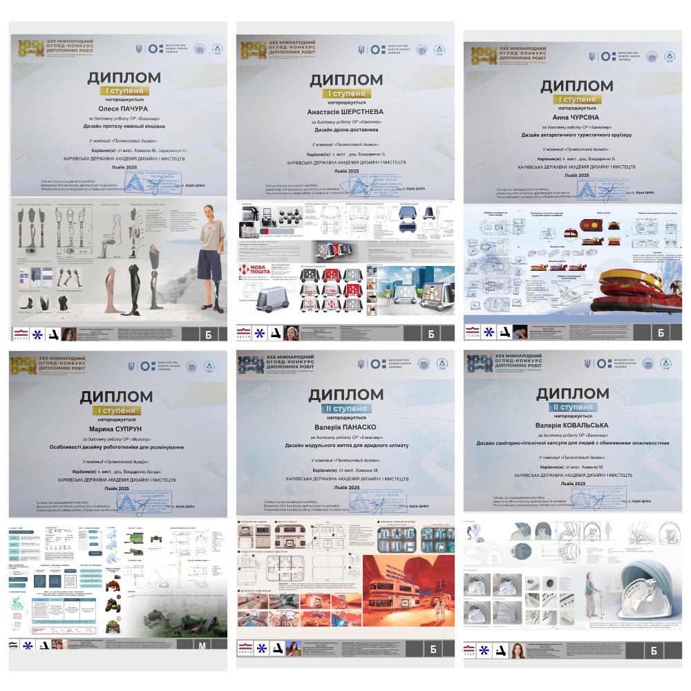 Від кафедри дизайну нашої Академії було представлено 9 дипломних проєктів (6 бакалаврських і 3 магістерські). Роботи наших студентів отримали високі оцінки журі та відзнаки у номінаціях, засвідчивши високий рівень професійної підготовки й креативного мислення випускників.