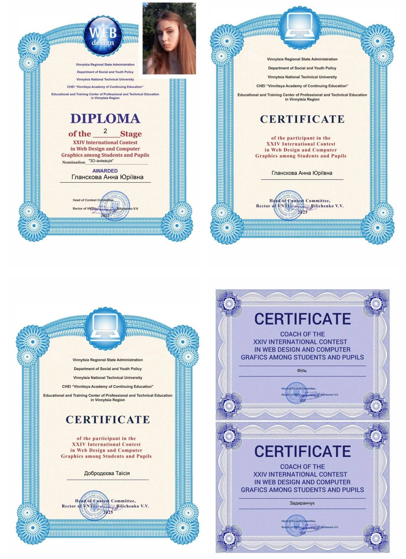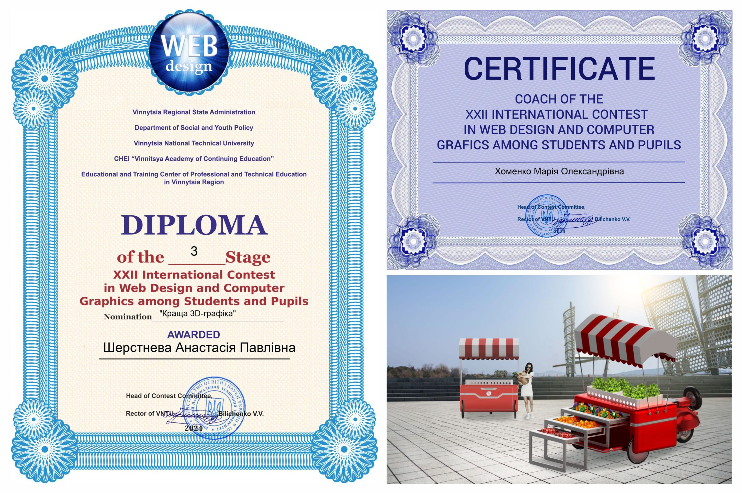 • Вітаємо Анастасію Шерстневу, студентку 4 курсу, та викладача Марію Хоменко з перемогою у 22 Міжнародному конкурсі з веб-дизайну та комп’ютерної графіки. Конкурс щорічно проводить Вiнницький нацiональний технiчний унiверситет, а саме, кафедра програмного забезпечення. Бажаємо Анастасії натхнення, нових ідей і невичерпної енергії для підкорення творчих вершин. Впевнені, що попереду вас чекає ще багато перемог і яскравих моментів!