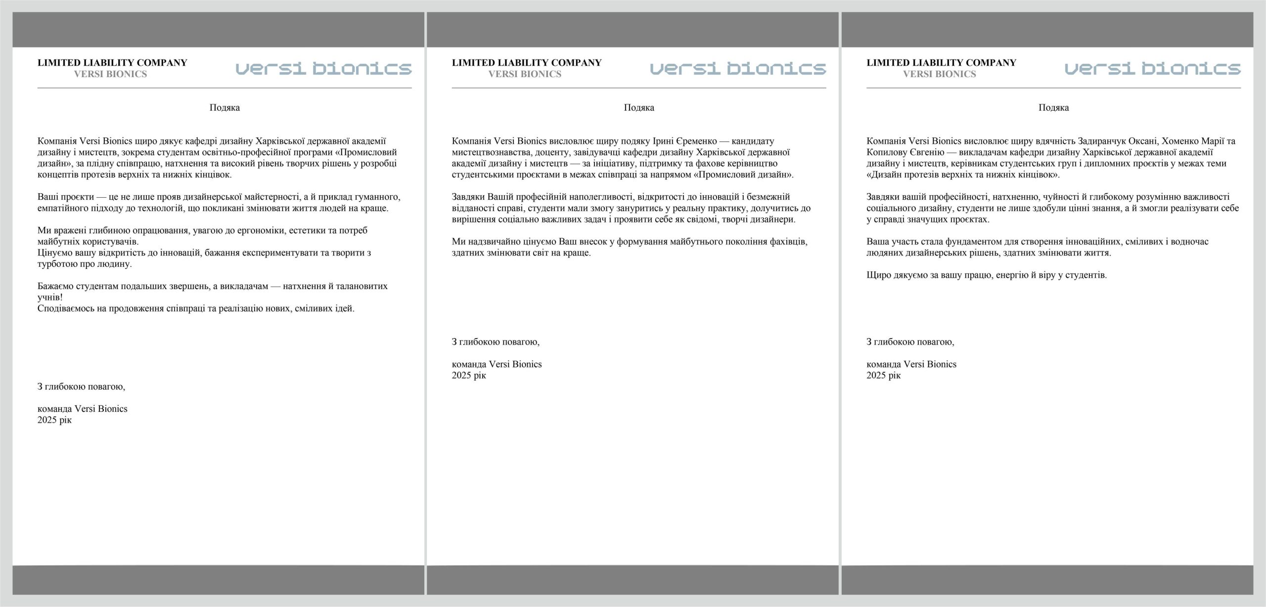 Компанія Versi Bionics щиро дякує кафедрі дизайну Харківської державної академії дизайну і мистецтв, зокрема студентам освітньо-професійної програми «Промисловий дизайн», за плідну співпрацю, натхнення та високий рівень творчих рішень у розробці концептів протезів верхніх та нижніх кінцівок. Ваші проєкти — це не лише прояв дизайнерської майстерності, а й приклад гуманного, емпатійного підходу до технологій, що покликані змінювати життя людей на краще. Ми вражені глибиною опрацювання, увагою до ергономіки, естетики та потреб майбутніх користувачів. Цінуємо вашу відкритість до інновацій, бажання експериментувати та творити з турботою про людину. Бажаємо студентам подальших звершень, а викладачам — натхнення й талановитих учнів! Сподіваємось на продовження співпраці та реалізацію нових, сміливих ідей. З глибокою повагою, команда Versi Bionics 2025 рік