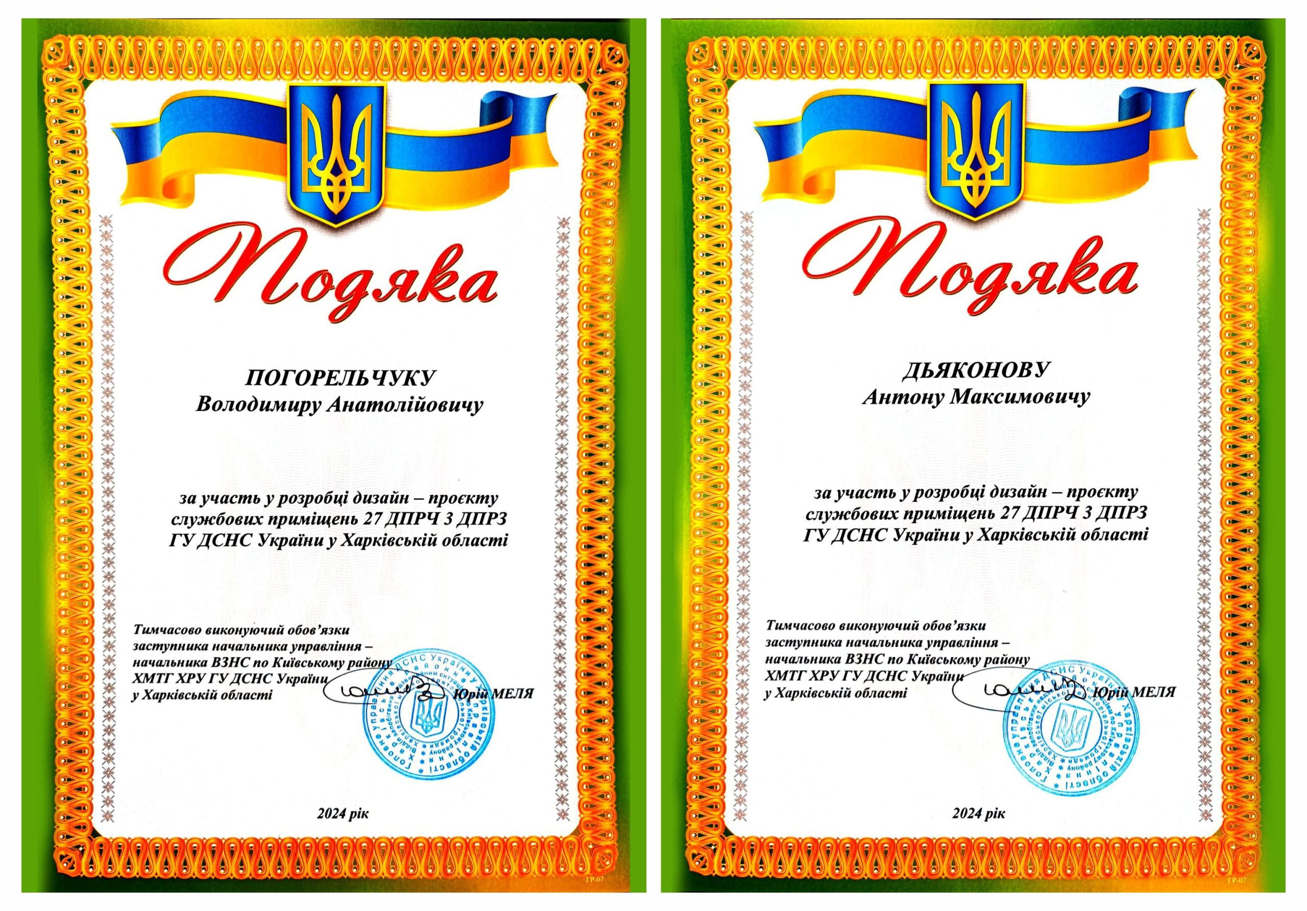 Вітаємо викладачів нашої кафедри проф. Погорельчука Володимира та Дьяконова Антона з отриманням подяки від ВЗНС Харківської області за участь у розробці дизайн-проєкту службових приміщень.