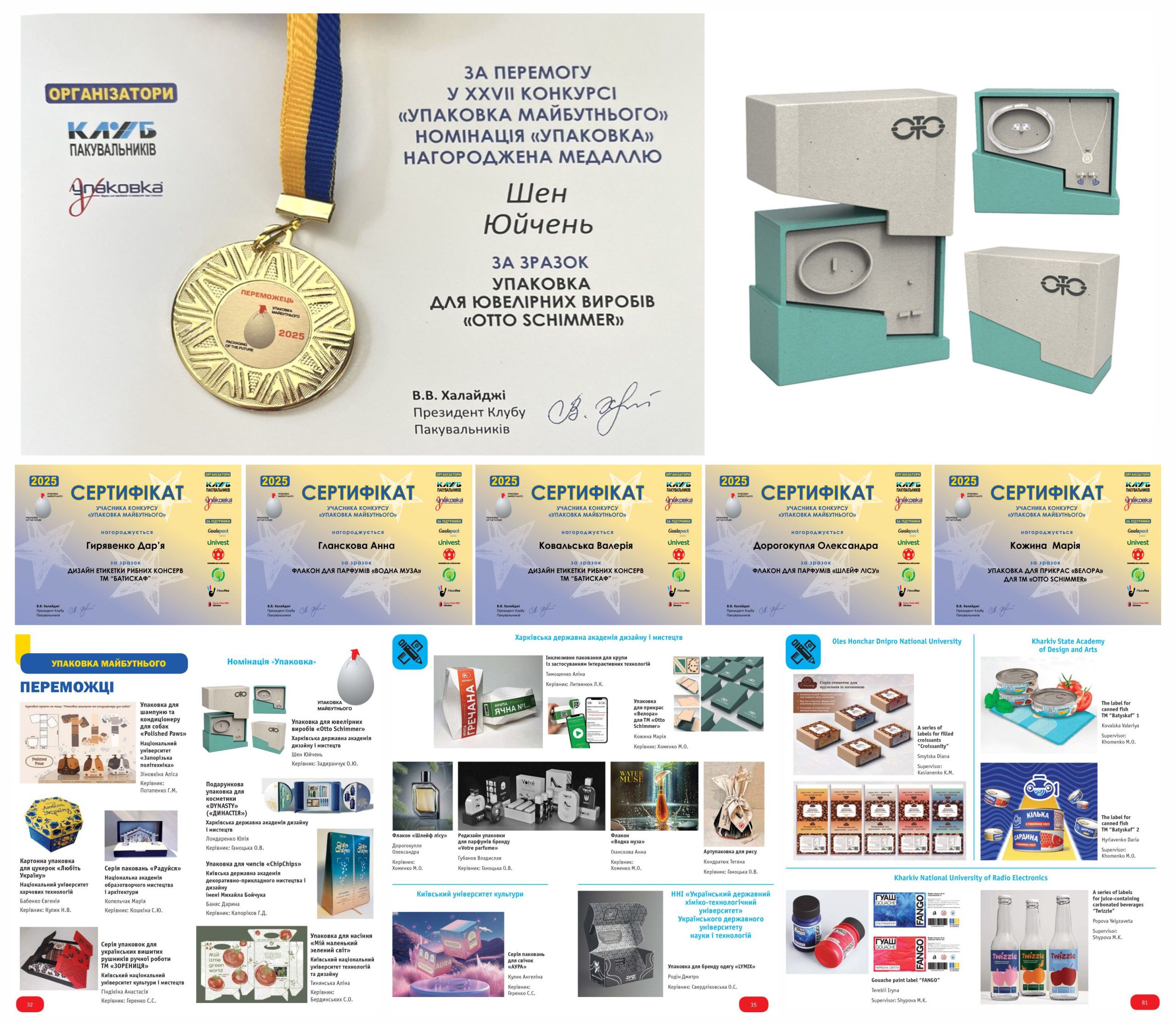 Вітаємо студента 4 курсу Шен Юйченя та викладача Задиранчук Оксану з перемогою у Всеукраїнському конкурсі «Упаковка майбутнього» зразком упаковки для ювелірних виробів « Otto Schimmer », а також учасників конкурсу «Упаковка майбутнього», студентів 3 курсу Дорогокуплю Олександру та Гланскову Анну, а також студентів 4 курсу Ковальську Валерію, Гирявенко Дар’ю та Кожину Марію з отриманням сертифікатів.