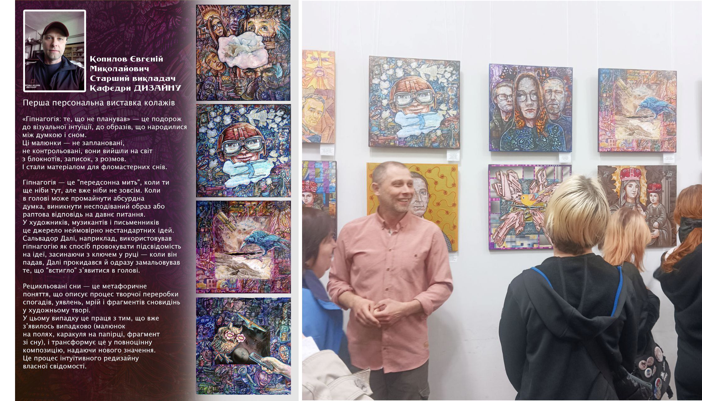 Вітаємо нашого талановитого викладача кафедри «Дизайн» Євгена КОПИЛОВА з персональною виставкою «Гіпнагогія. Те, що не планував». Унікальна можливість поспілкуватися з автором на виставці дозволить ближче ознайомитися з концепцією виставки та цікавою колажною технікою, в якій створені роботи.