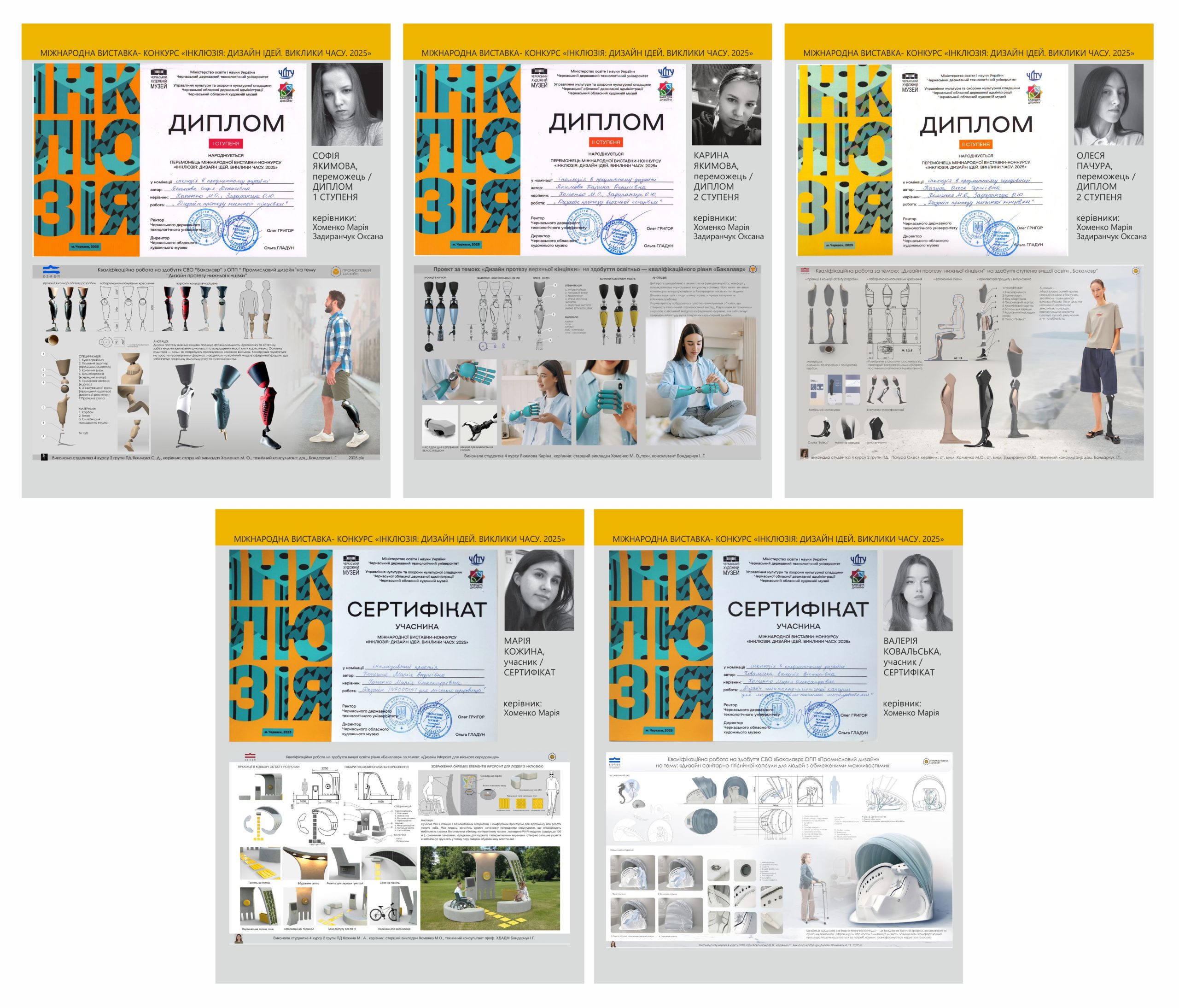 СОФІЯ ЯКИМОВА /ДИПЛОМ І СТУПЕНЯ/, КАРИНА ЯКИМОВА /ДИПЛОМ ІІ СТУПЕНЯ/, ОЛЕСЯ ПАЧУРА /ДИПЛОМ ІІ СТУПЕНЯ/, МАРІЯ КОЖИНА /СЕРТИФІКАТ УЧАСНИКА/ ТА КОВАЛЬСЬКА ВАЛЕРІЯ /СЕРТИФІКАТ УЧАСНИКА/ та їх керівників – Марію Хоменко та Оксану Задиранчук. 20 листопада кафедра дизайну Черкаського державного технологічного університету спільно з Черкаським обласним художнім музеєм презентували виставку «Інклюзія: дизайн ідей. Виклики часу. 2025» Серед учасників — 19 провідних фахових вищих навчальних закладів України та Китаю, професійні дизайнери і художники країн світу (Україна, Китай, Франція, Канада, США, Колумбія, Бельгія, Південна Корея, Австрія). Всього представлено близько 100 робіт.