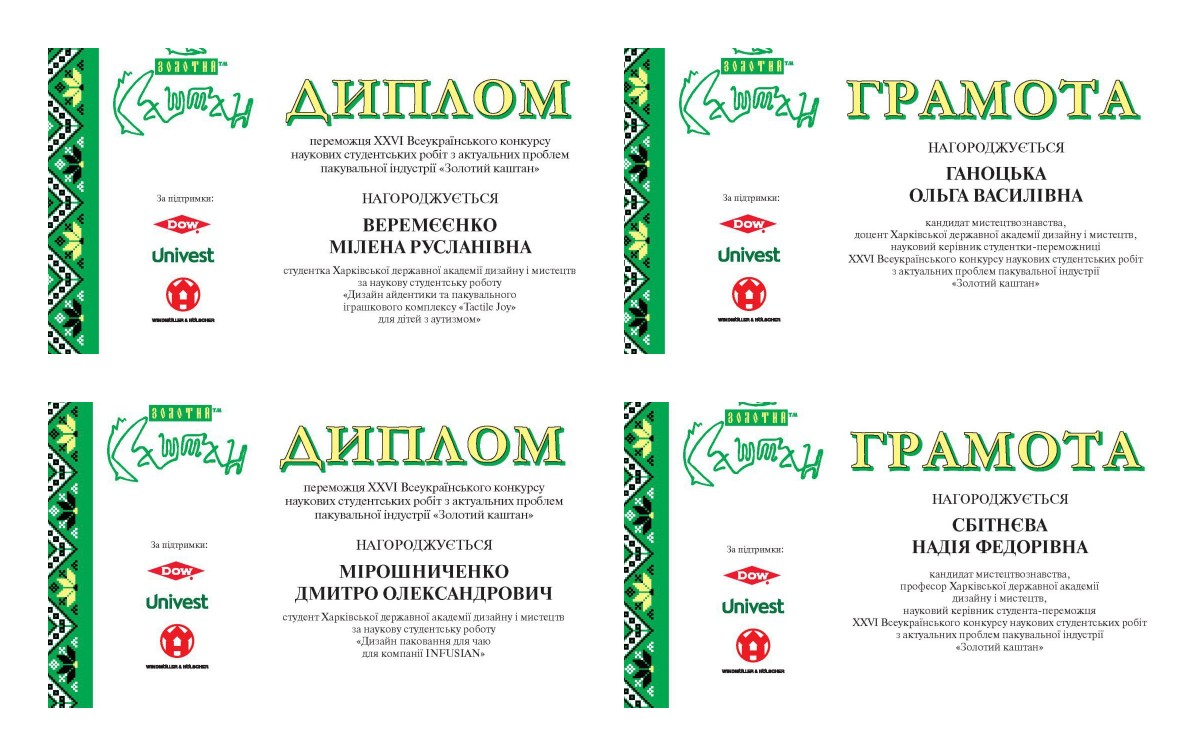 • Вітаємо наших студенток та їх керівників із перемогою у Всеукраїнському конкурсі кваліфікаційних робіт студентів закладів вищої освіти зі спеціальності 022 Дизайн за першим (бакалаврським) та другим (магістерським) рівнями вищої освіти у номінації «Графічний дизайн», які були захищені у 2022-2023 н.р.