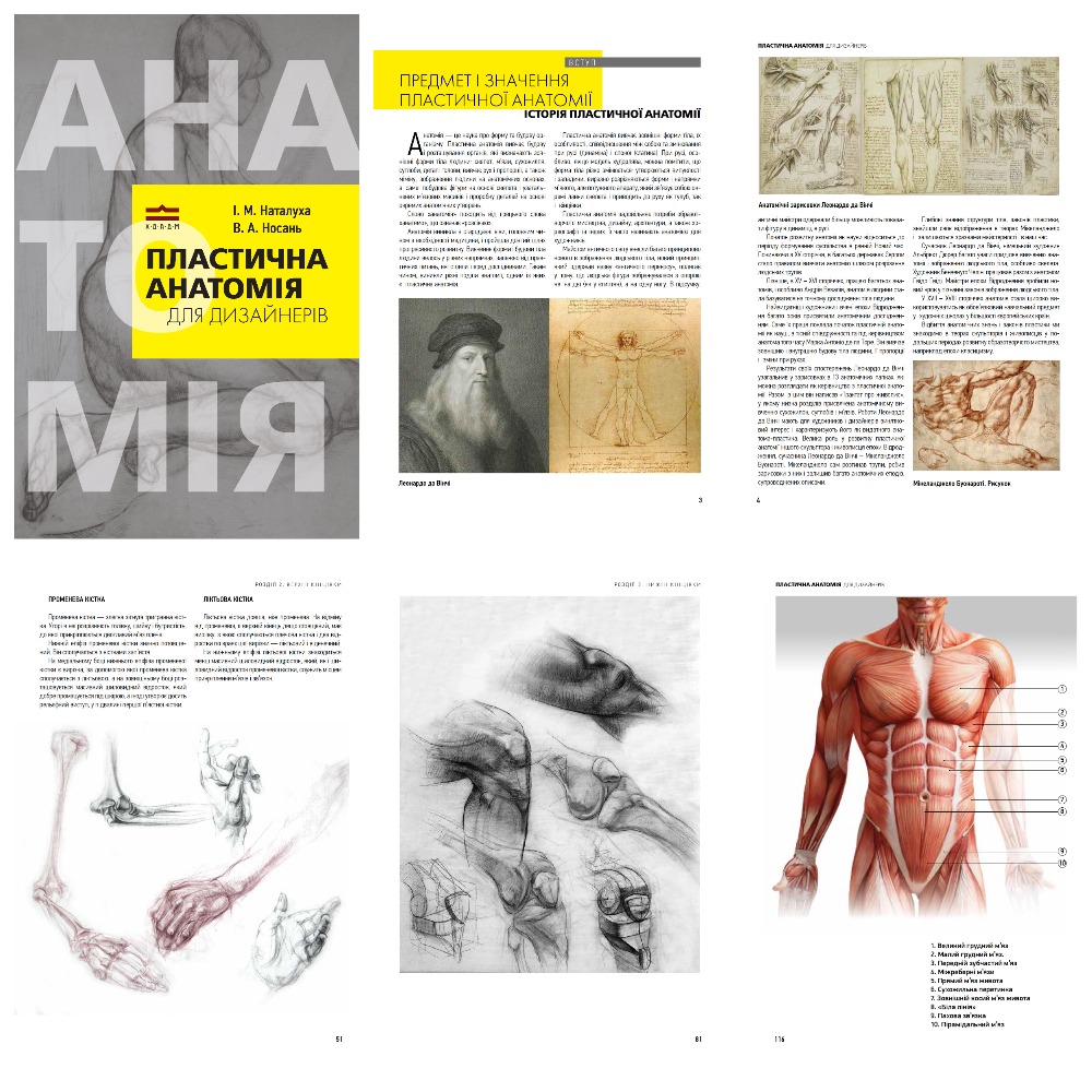 Кафедра рисунка представляє навчально-наочний посібник: «Пластична анатомія для дизайнерів», створений у 2024 році на основі досвіду багаторічного викладання авторів в Харківській державній академії дизайну і мистецтв. У книзі описано особливості будови людського тіла, фігури, кінцівок. Багато уваги приділяється характеру і механіці рухів людини. Навчально-наочний посібник являє собою докладний довідник для художників та дизайнерів, присвячений анатомічному вивченню та конструктивній побудові людського тіла. Автори: І. М. Наталуха, В. А. Носань; за заг. ред. проф. О. В. Соболєва. Харків, 2024. 151 с.