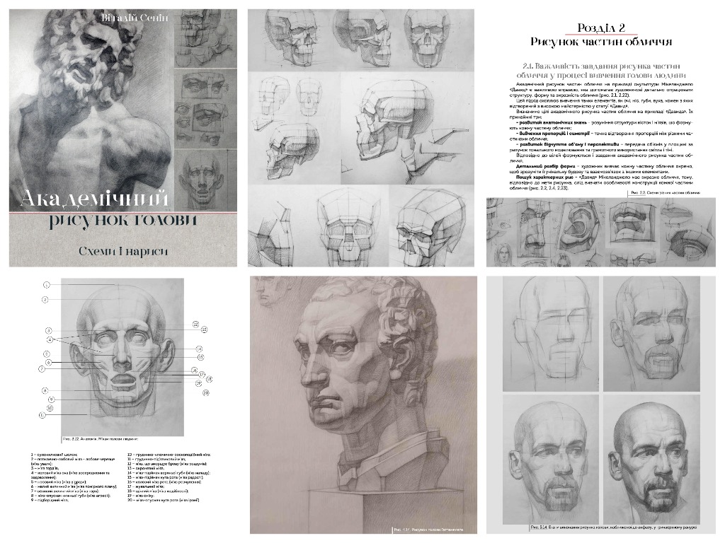 Кафедра рисунка представляє навчальний посібник старшого викладача Віталія Сеніна «Академічний рисунок голови: схеми і нариси». Запропонований навчальний посібник являє собою систематичний виклад курсу академічного рисунка голови для здобувачів першого рівня фахової мистецької освіти художніх вишів. Автор, спираючись на методи схематизації, дедукції та індукції у викладі матеріалу, порівняльного аналізу та художньо-графічного аналізу, послідовно розглядає усі надважливі етапи рисунка голови; закони його конструктивної та анатомічної будови, композиційного рішення, стилістичної визначеності тощо. Виклад змісту дисципліни ґрунтується на авторському зображальному матеріалі та відповідає традиції викладання рисунка, що склалася у межах Харківської художньої школи і Харківської академії дизайну та мистецтв. Видання призначене для здобувачів мистецьких закладів вищої освіти та коледжів фахової передвищої освіти, також може бути корисним як теоретичний, методичний і практичний посібник для викладачів та вчителів художніх шкіл. Сенін Віталій. Академічний рисунок: схеми і нариси: навч. посіб. Харків: ХДАДМ, 2025. 184 с.