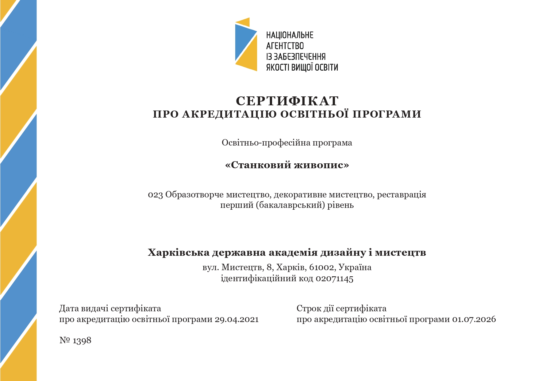 СЕРТИФІКАТ ПРО АКРЕДИТАЦІЮ ОСВІТНЬОЇ ПРОГРАМИ «СТАНКОВИЙ ЖИВОПИС», 2021 р. (.pdf)