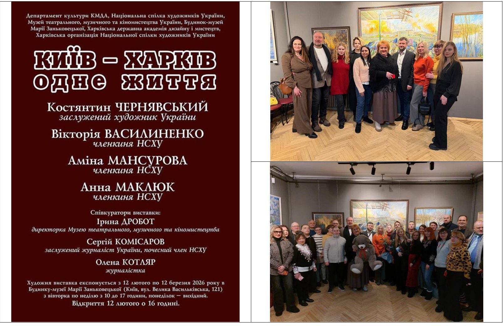 • 12 лютого 2026 року у Будинку-музеї Марії Заньковецької відбулося відкриття виставки «Київ — Харків: одне життя» — мистецького проєкту, що осмислює досвід війни через образ міста, пам’ять та діалог поколінь. Проєкт об’єднав доцента кафедри живопису, голову Національної спілки художників України, Заслуженого художника України Костянтина Чернявського та молодих художниць — Вікторію Василиненко, Аміну Мансурову й Анну Маклюк, здобувачів вищої освіти 4 курсу ОПП «Станкового живопис» ХДАДМ. Творчий симбіоз став спільним художнім висловлюванням про війну, незламність і життя, що триває. Київ і Харків у роботах постають не лише як географічні простори, а як символи пам’яті, стійкості та внутрішньої сили, це колективна рефлексія на сучасну реальність.