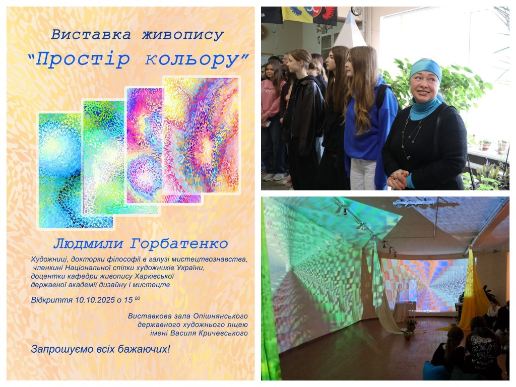 • 11 жовтня 2025 року відкрилась персональна виставка живопису «Простір кольору» докторки філософії в галузі мистецтвознавства, членкині НСХУ, доцентки кафедри живопису ХДАДМ Людмили Горбатенко у виставковій залі Опішнянського державного художнього ліцею імені Василя Кричевського. У рамках виставки художниця провела для вихованців Опішнянського державного художнього ліцею імені Василя Кричевського захоплюючий майстер-клас. Фінісаж виставки живопису «Простір кольору» харківської художниці Людмили Горбатенко відбувся в атмосфері справжнього свята музики кольору. Світлова інсталяція картин авторки заповнила простір зали під акомпонемент фортепіано. Сучасне мистецтво все більше розширює можливості та межі сприйняття для глядача. Зануритись у вир кольору та розмаїття його відтінків, прорелаксувати, помріяти та зарядитись енергією й гармонією – все це про виставку «Простір кольору»