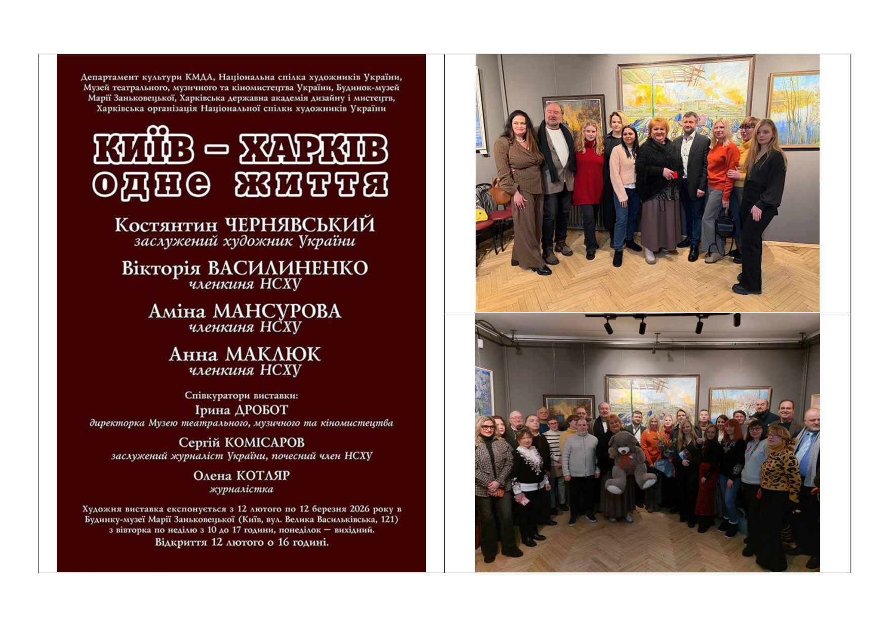 • 12 лютого 2026 року у Будинку-музеї Марії Заньковецької відбулося відкриття виставки «Київ — Харків: одне життя» — мистецького проєкту, що осмислює досвід війни через образ міста, пам’ять та діалог поколінь. Проєкт об’єднав доцента кафедри живопису, голову Національної спілки художників України, Заслуженого художника України Костянтина Чернявського та молодих художниць — Вікторію Василиненко, Аміну Мансурову й Анну Маклюк, здобувачів вищої освіти 4 курсу ОПП «Станкового живопис» ХДАДМ. Творчий симбіоз став спільним художнім висловлюванням про війну, незламність і життя, що триває. Київ і Харків у роботах постають не лише як географічні простори, а як символи пам’яті, стійкості та внутрішньої сили, це колективна рефлексія на сучасну реальність.