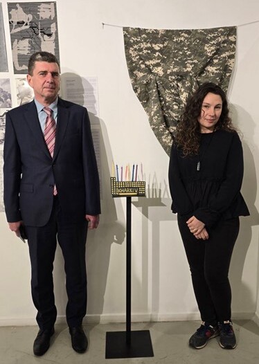 Катерина Діденко (студентка СЖ-25-1) з паном Брескаленко Геннадієм Семеновичем – радником-посланником України в державі Ізраїль на відкритті виставки “Це (не) моя війна”, в Ізраїлі