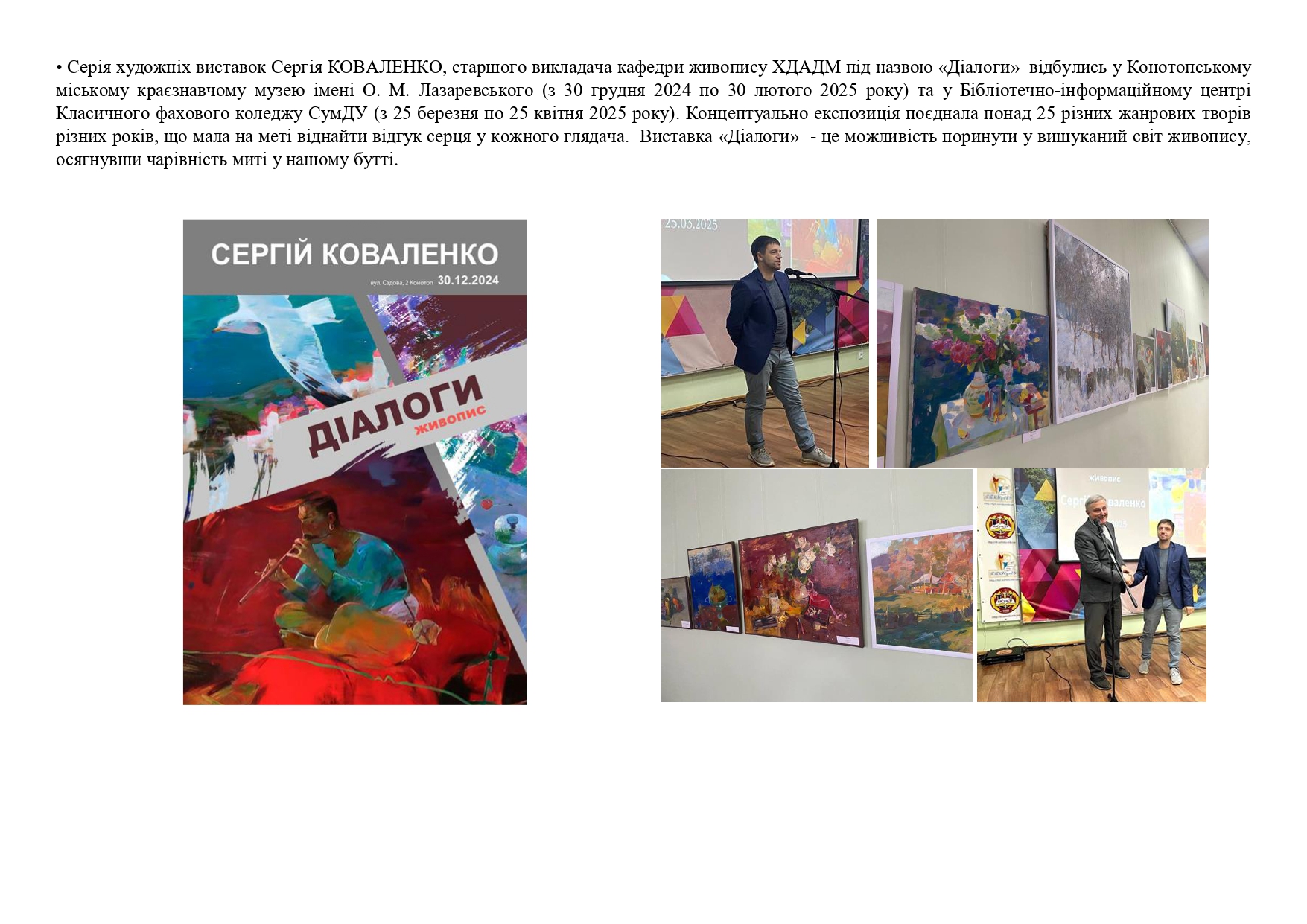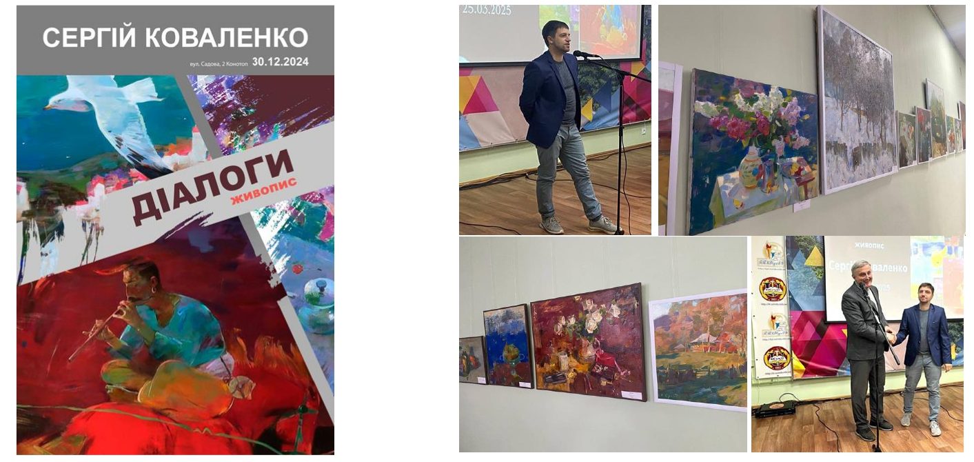 • Серія художніх виставок Сергія КОВАЛЕНКО, старшого викладача кафедри живопису ХДАДМ під назвою «Діалоги» відбулись у Конотопському міському краєзнавчому музею імені О. М. Лазаревського (з 30 грудня 2024 по 30 лютого 2025 року) та у Бібліотечно-інформаційному центрі Класичного фахового коледжу СумДУ (з 25 березня по 25 квітня 2025 року). Концептуально експозиція поєднала понад 25 різних жанрових творів різних років, що мала на меті віднайти відгук серця у кожного глядача. Виставка «Діалоги» – це можливість поринути у вишуканий світ живопису, осягнувши чарівність миті у нашому бутті.