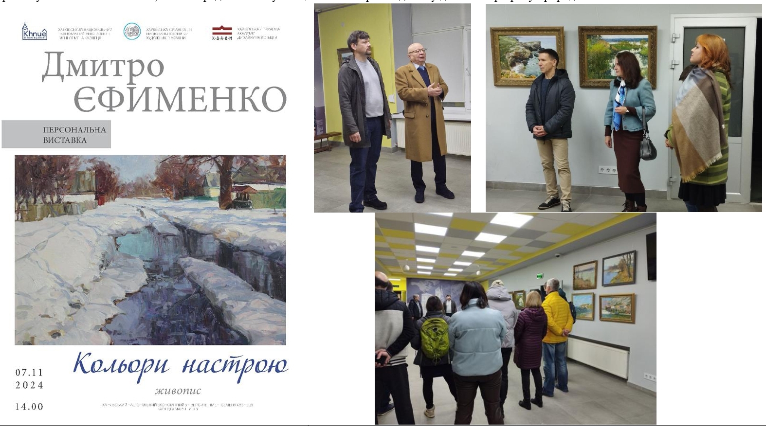 • 7 листопада 2024 року відкрилась персональна виставка «Кольори настрою» доцента кафедри живопису ХДАДМ, заслуженого діяча мистецтв України Дмитра ЄФИМЕНКО у Коворкінг-центрі Харківського Національного економічного університеті імені Семена КУЗНЕЦЯ. Виставка презентує пейзажний живопис, який передає глибину емоційного настрою від стану доби та пори року природи.