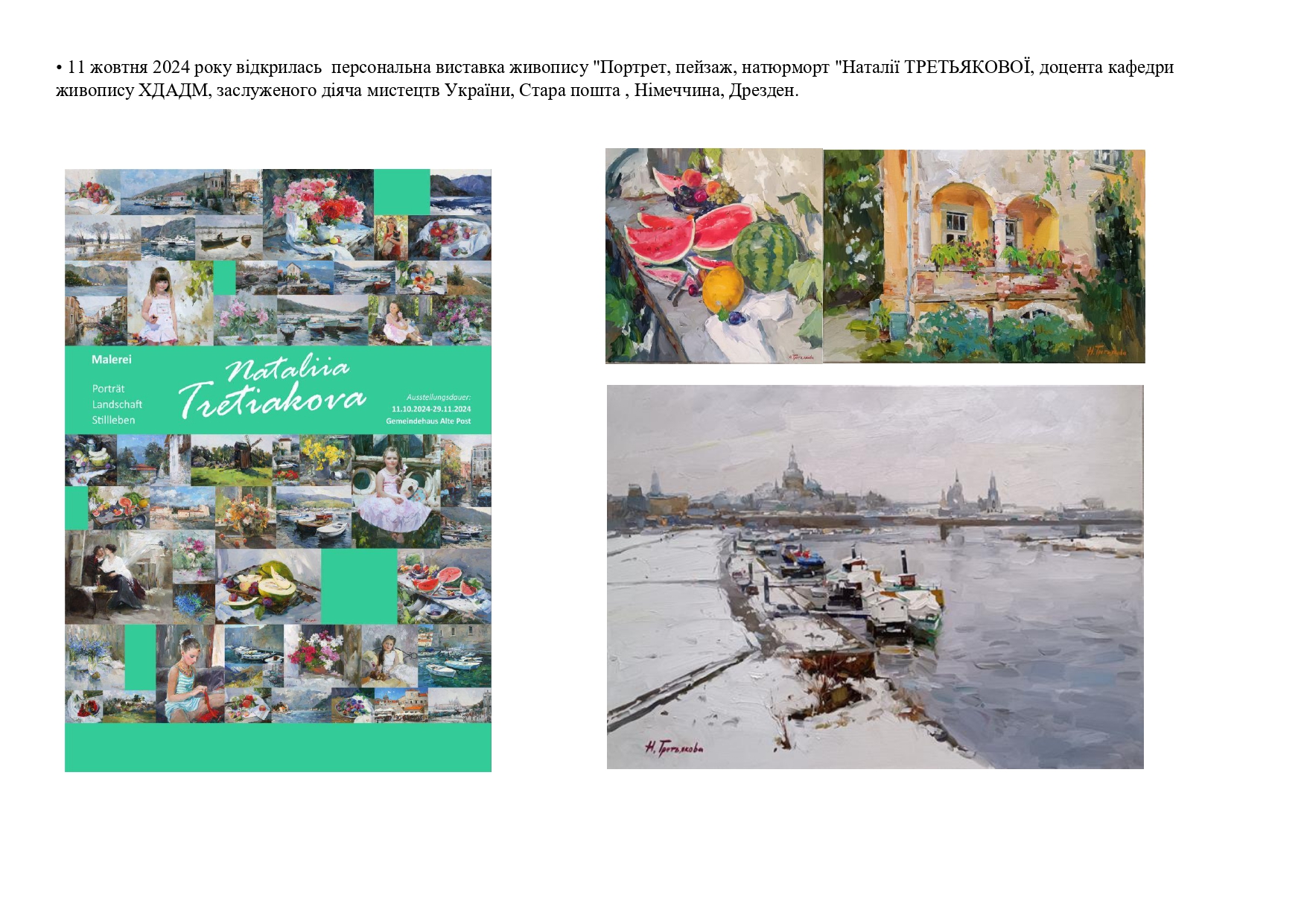• 11 жовтня 2024 року відкрилась персональна виставка живопису “Портрет, пейзаж, натюрморт “Наталії ТРЕТЬЯКОВОЇ, доцента кафедри живопису ХДАДМ, заслуженого діяча мистецтв України, Стара пошта , Німеччина, Дрезден.