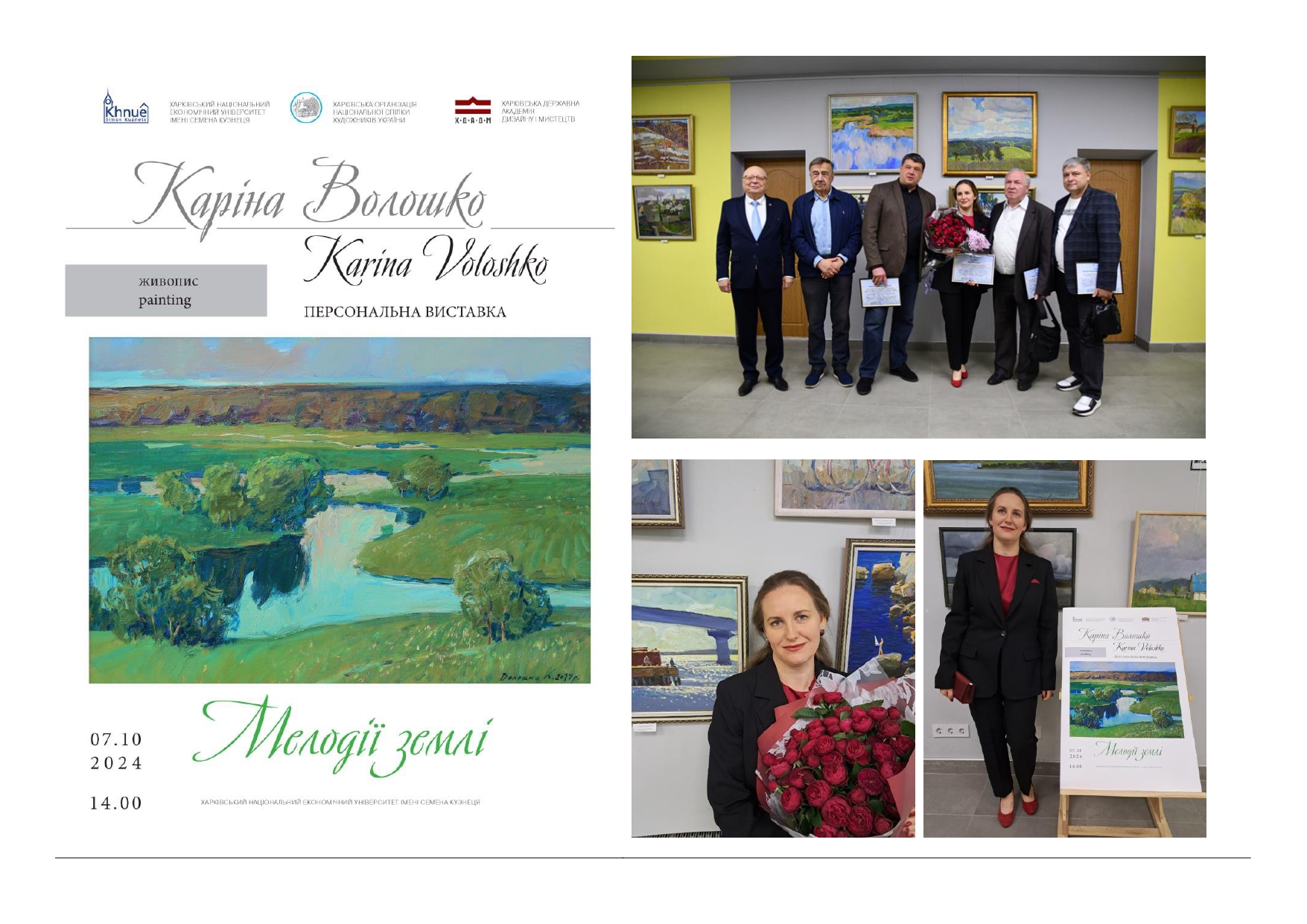 • 07 жовтня 2024 року у ХНЕУ ім. С. Кузнеця відкрилась персональна виставка «Мелодії землі» старшого викладача кафедри живопису ХДАДМ, членкині НСХУ Каріни ВОЛОШКО, в рамках засідання Спілки ректорів Харківської області за участі заступника Міністра освіти і науки України Михайла Винницького, Міського голови Ігоря Терехова та голови ХОВА Олега Синєгубова, під час якого, учасники обговорили важливість підготовки спеціалістів у сфері ментального здоров’я, а також створення умов у вищих навчальних закладах.