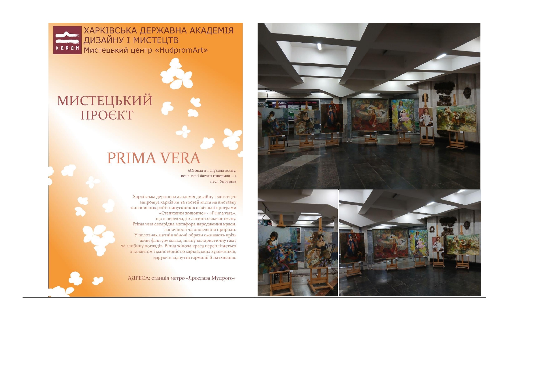 З другої половини жовтня 2025 року станція метро «Ярослава Мудрого» у Харкові перетворилася на унікальний мистецький простір, де живопис говорить про найголовніше – про внутрішню силу, надію та віру. Кожна картина – це  особистий досвід, емоційний пошук і відображення внутрішнього світу молодих митців. У творах – прагнення до мирного життя, якого сьогодні так бракує кожному з нас. Мистецький проєкт став  частиною щоденного життя містян, своєрідним  діалогом між художниками та містом – емоційним, відкритим, наповненим сенсами.