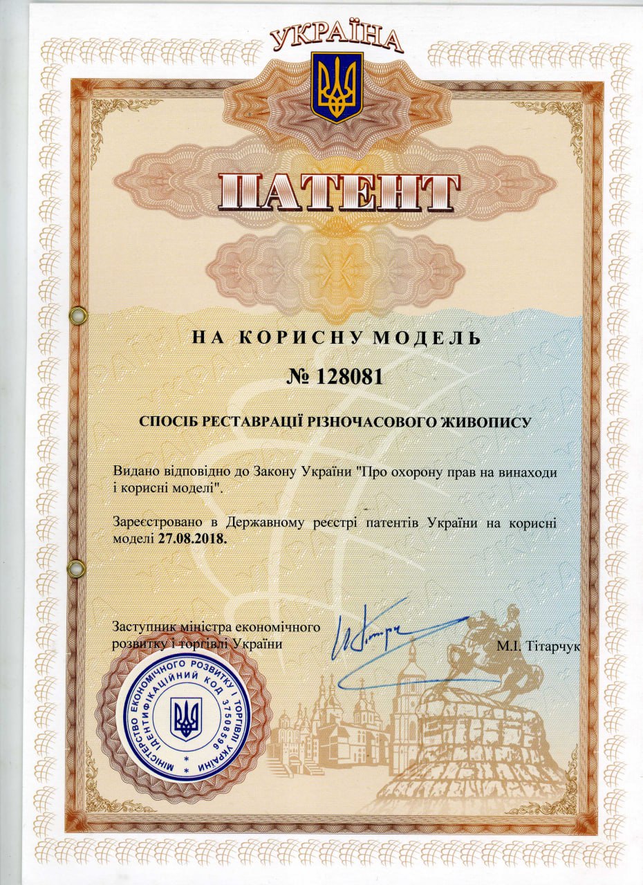 №128081 Патент на корисну модель "Спосіб реставрації різночасового живопису" Терехов Максим Олегович, Долуда Анатолій Олександрович.