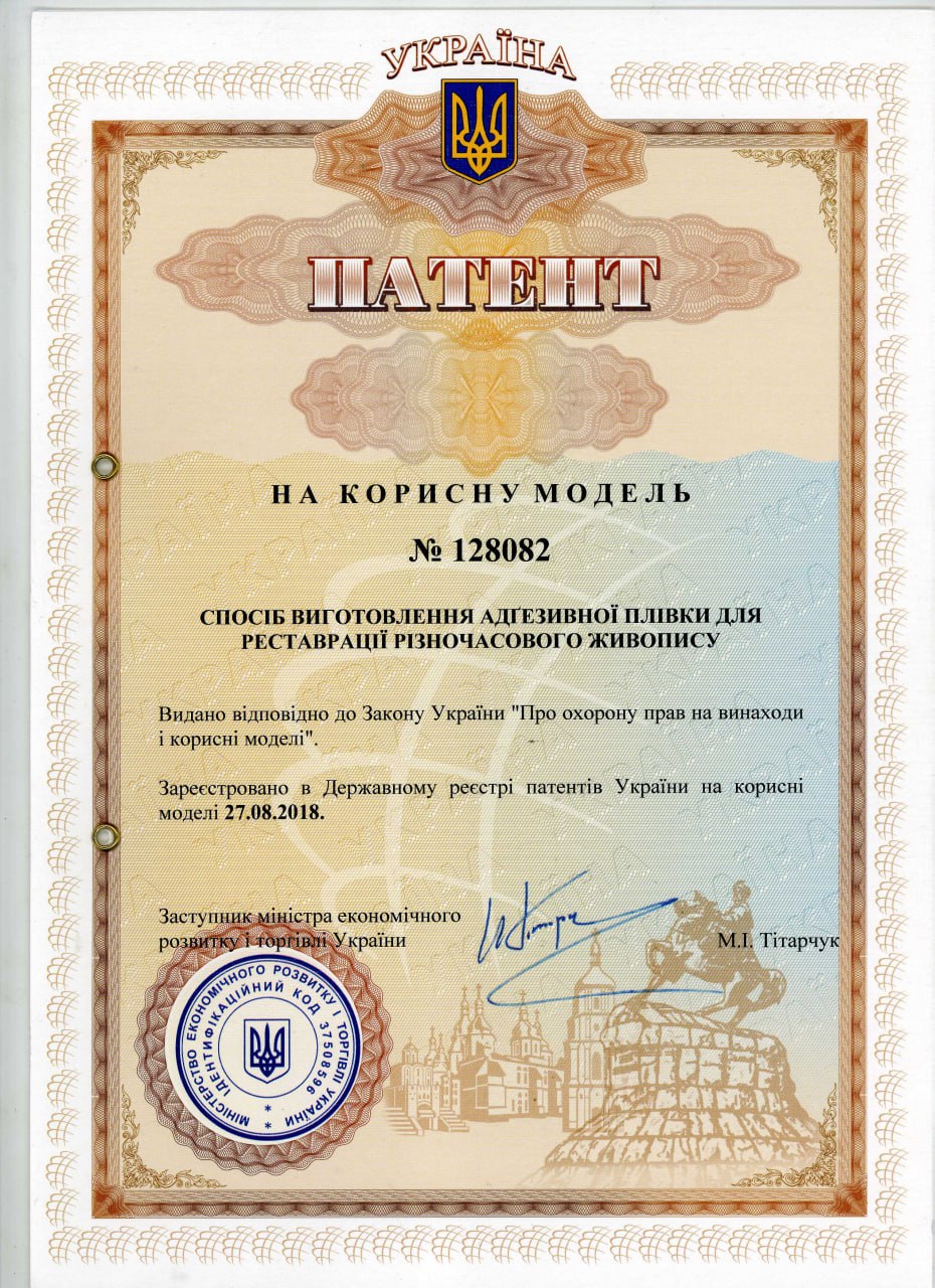 №128082 Патент на корисну модель СПОСІБ ВИГОТОВЛЕННЯ АДҐЕЗИВНОЇ ПЛІВКИ ДЛЯ РЕСТАВРАЦІЇ РІЗНОЧАСОВОГО ЖИВОПИСУ. Терехов Максим Олегович, Долуда Анатолій Олександрович.