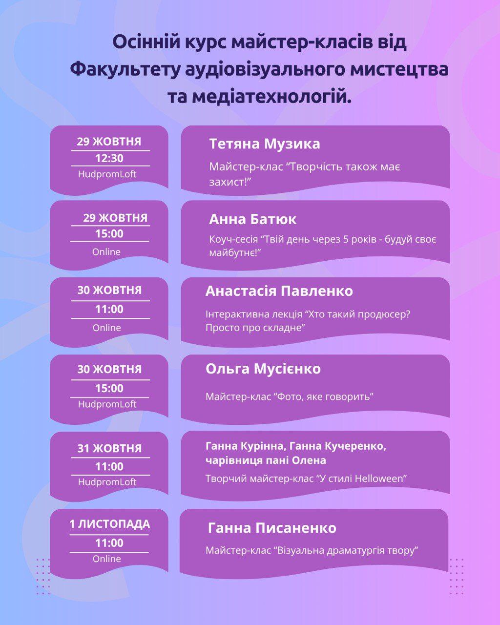 У дні осінніх канікул ФАКУЛЬТЕТ АУДІОВІЗУАЛЬНОГО МИСТЕЦТВА ТА МЕДІАТЕХНОЛОГІЙ провів низку майстер-класів для школярів у форматах online та offline.
