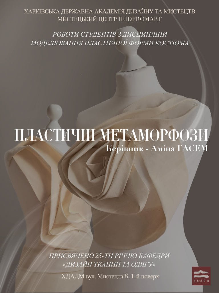 29 вересня 2025 року в затишному мистецькому просторі ХАРКІВСЬКОЇ ДЕРЖАВНОЇ АКАДЕМІЇ ДИЗАЙНУ І МИСТЕЦТВ відбулося справжнє свято творчості – відкриття виставки, яка поєднала творчі експерименти студентів у межах дисципліни «Моделювання пластичної форми костюма» з особистим авторським баченням форми від Аміни ГАСЕМ.