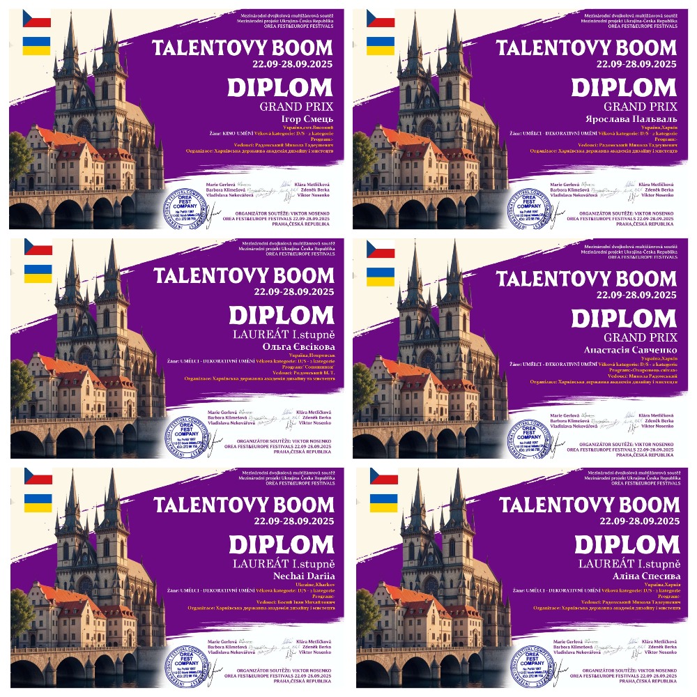 Вітаємо студентів 4 курсу кафедри Дизайну середовища – переможців міжнародного двотурового конкурсу мистецтв TALENTOVÝ BOOM. ЧЕХІЯ, ПРАГА, 22 – 28.09.2025