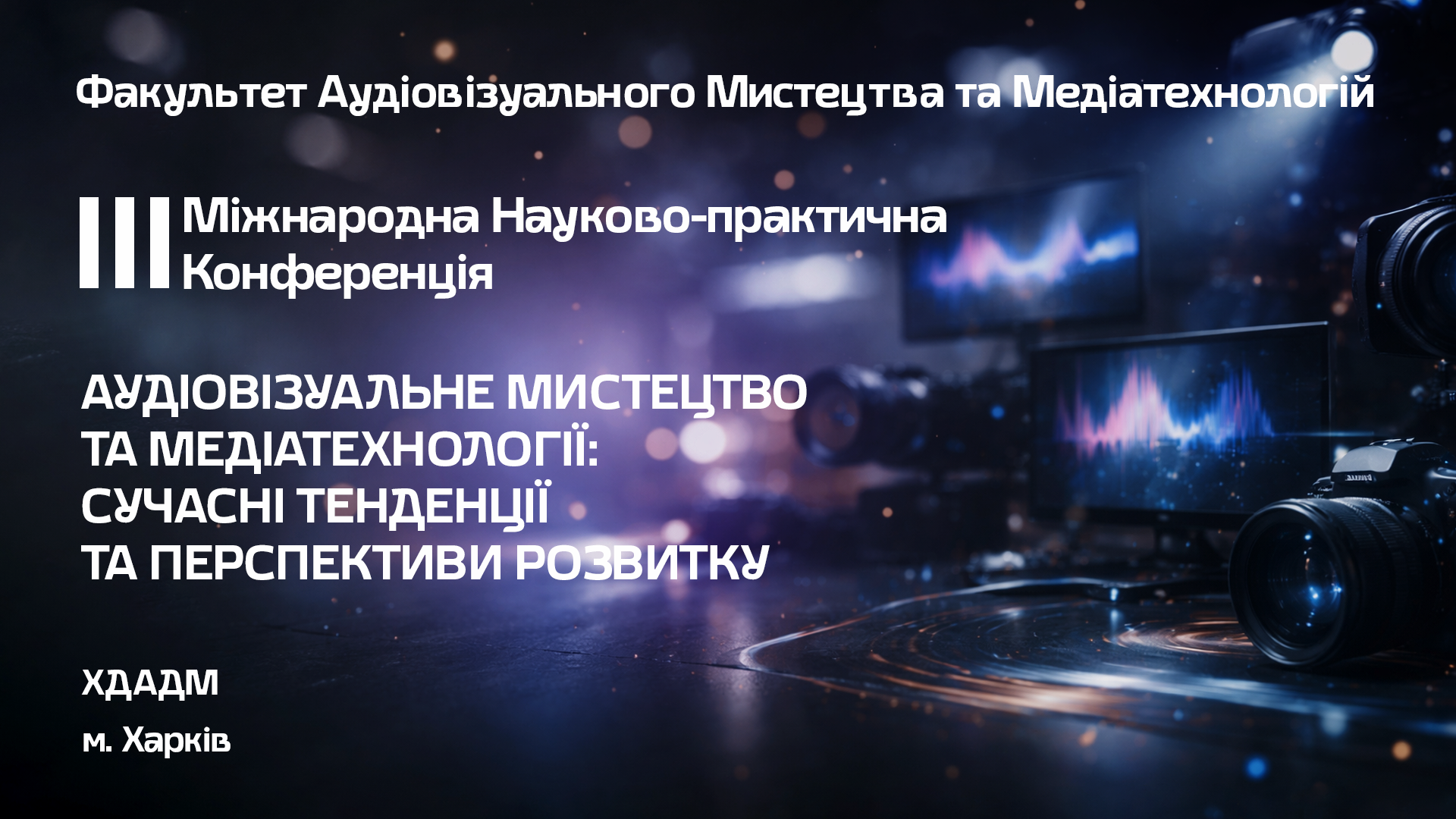 14-15 травня 2026 року Факультет аудіовізуального мистецтва та медіатехнологій Харківської державної академії дизайну і мистецтв проводить ІІІ Міжнародну науково-практичну конференцію «АУДІОВІЗУАЛЬНЕ МИСТЕЦТВО ТА МЕДІАТЕХНОЛОГІЇ: сучасні тенденції та перспективи розвитку».